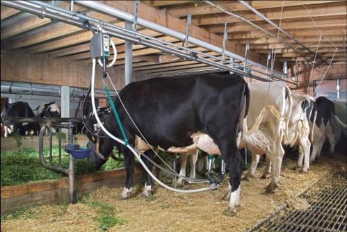 В процессе доения молоко поступает из коллектора доильного аппарата по молокопроводу в молокоприемник, затем из молокоприемника молочным насосом через фильтр перекачивается в охладитель для хранения.
